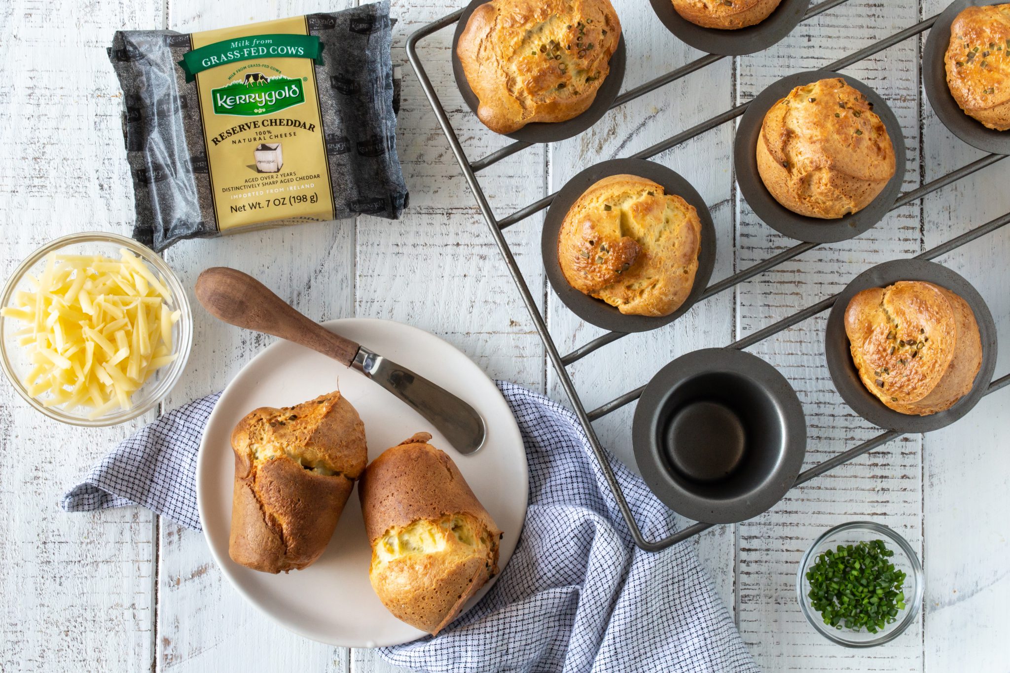 Ingredients: eggs, milk, cheddar cheese, flour, unsalted butter, chives, salt